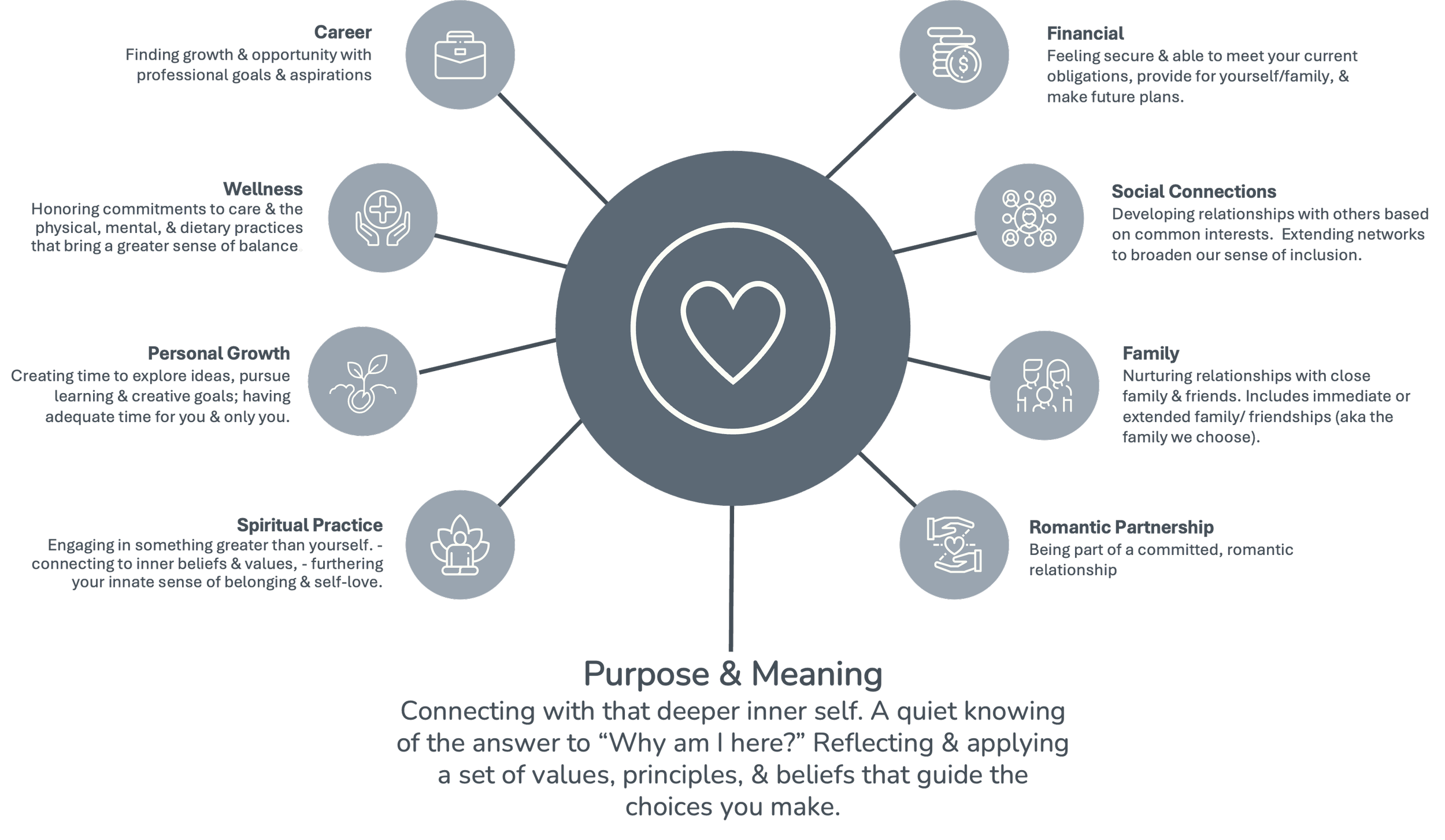 We place “purpose and meaning” at the center, viewing it as the “root” of intention—where our longing for shifts in our lives, lifestyles, careers, and relationships originates. You can think of the eight areas that wrap around purpose as the ecosystems or sub-components of what gives you a deeper sense that your life has meaning, value, and impact.